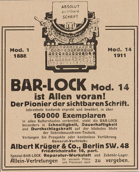 Werbeanzeige für Schreibmaschine Bar-Lock monochrom