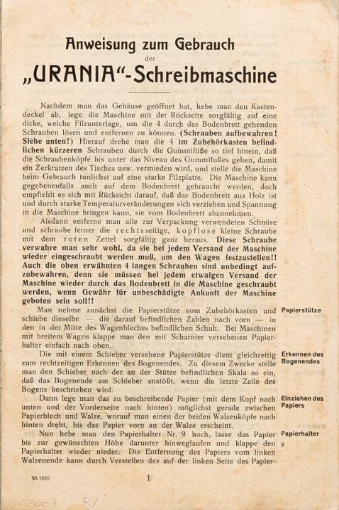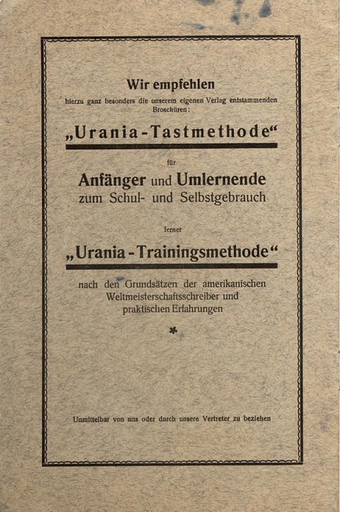 Urania Schreibmaschine Modell IV Anweisung zum Gebrauch