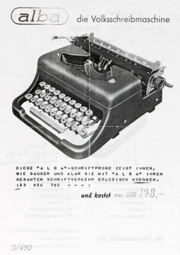 Prospekt für Schreibmaschine Alba; Fotokopie Schreibmaschine für Handwerk, Kleingewerbe, Privatgebrauch und für Jedermann