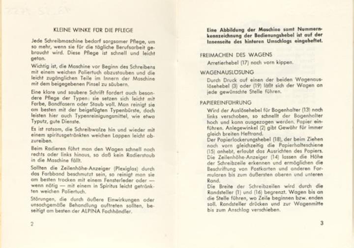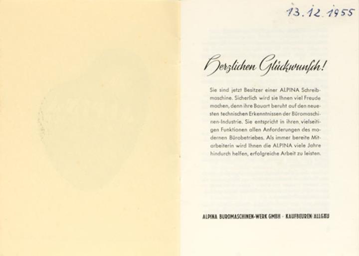 Bedienungsanleitung für Schreibmaschine Alpina Nr. 512 HoW-10-deutsch-10 4/55 Datum handschriftlich in Bedienungsanleitung vermerkt