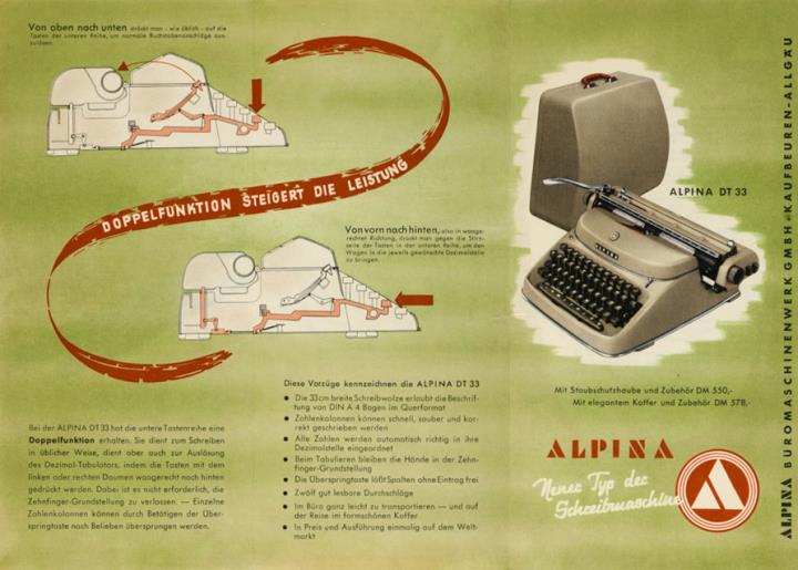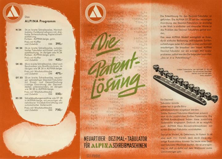 Faltprospekt für Alpina Schreibmaschinen mit Dezimaltabulator