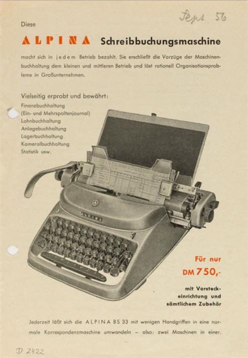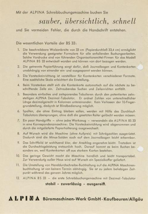 Prospekt für Schreibmaschine Alpina BS 33 Datum handschriftlich vermerkt