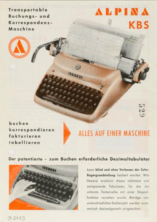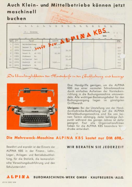 Prospekt für Schreibmaschine Alpina KBS Transportable Buchungs- und Korrespondenz-Maschine Nr. 612 GL OSXZ 10/58