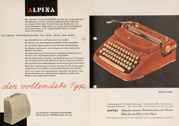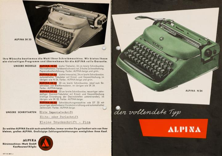 Faltprospekt für Alpina Schreibmaschinen 597/I 185 SWW 9.55