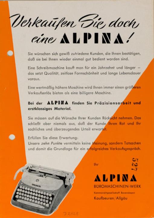 Faltprospekt für Alpina Schreibmaschine