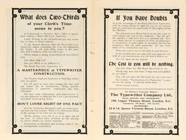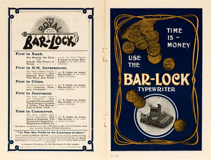 Faltprospekt für Schreibmaschine Royal Bar-Lock Time is money Use the Bar-Lock Typewriter