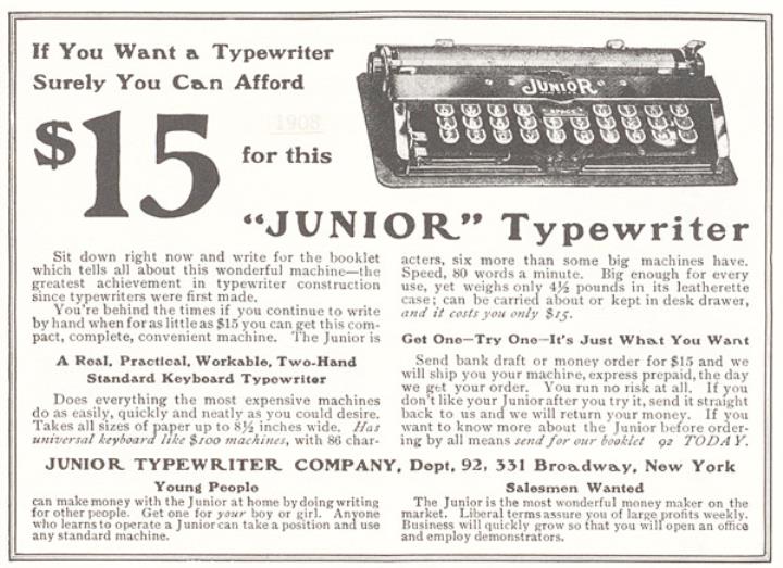 Werbeanzeige für Schreibmaschine Junior (Bennett) monochrom