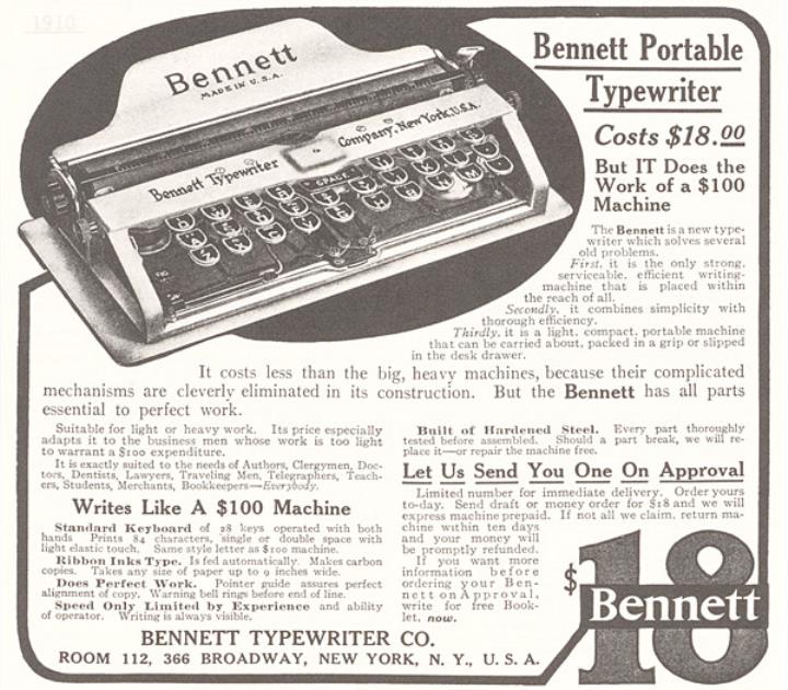 Werbeanzeige für Schreibmaschine Bennett monochrom