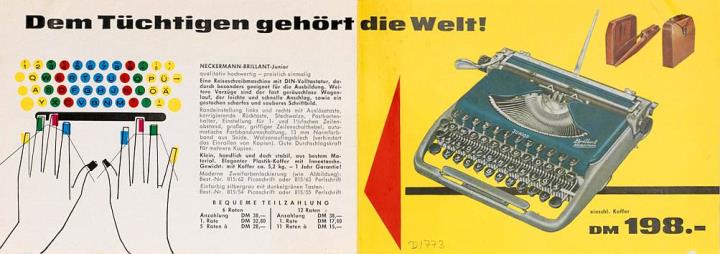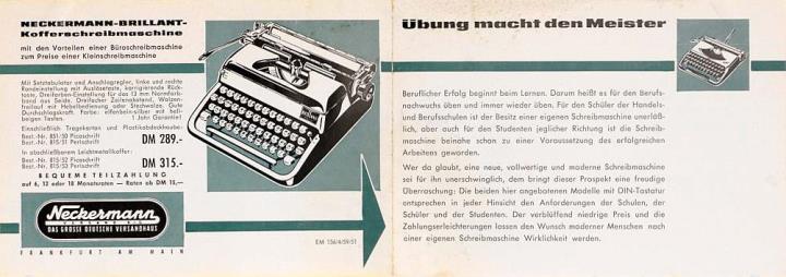 Faltprospekt für Schreibmaschine Neckermann Brillant Junior Dem Tüchtigen gehört die Welt! Nr. EM 156/4/59/51