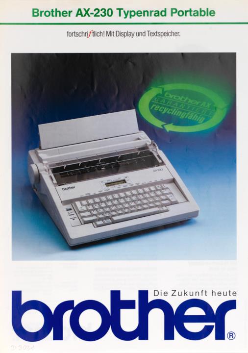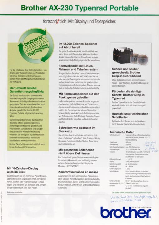 Prospekt für elektrische Schreibmaschine Brother AX-230 fortschri"f"tlich! Mit Display und Textspeicher