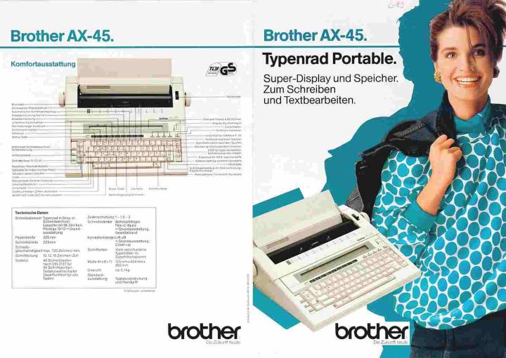 Faltprospekt für Schreibmaschine Brother AX-45 Super-Display und Speicher. Zum Schreiben und Textbearbeiten Nr. 88.10.2Brio100