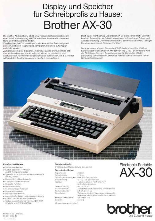 Prospekt für Schreibmaschine Brother AX-30 Display und Speicher für Schreibprofis zu Hause Nr. 86.03.1BRIO40