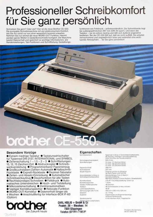 Prospekt für elektrische Schreibmaschine Brother CE-550 Professioneller Schreibkomfort für Sie ganz persönlich Nr. 86.03.1BRIO40