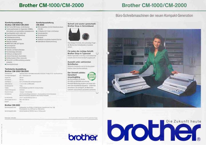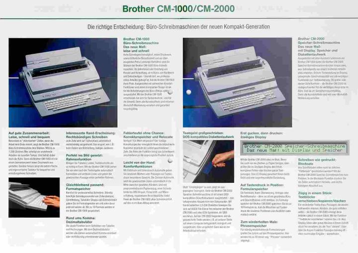 Faltprospekt für elektrische Schreibmaschine Brother CM1000, CM2000 Büro-Schreibmaschinen der neuen Kompakt-Generation Nr. 93.10.1 BRIO 100