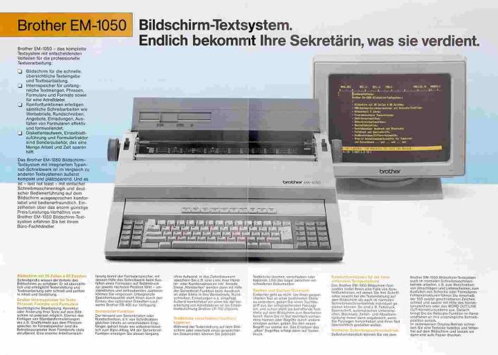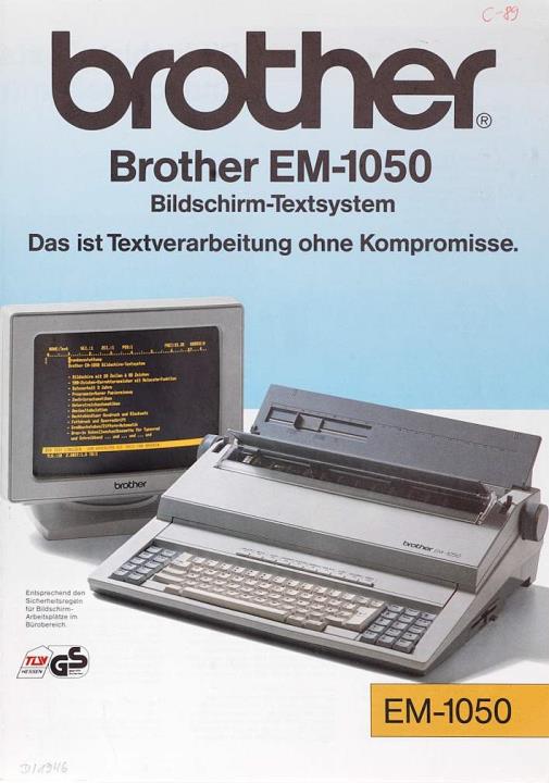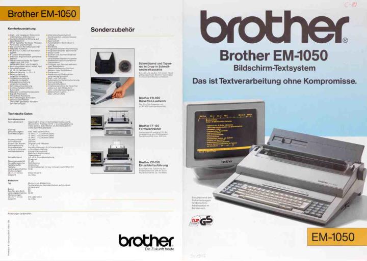 Faltprospekt für elektronische Schreibmaschine Brother EM-1050 Bildschirm-Textsystem Das ist Textverarbeitung ohne Kompromisse Nr. 89.01.1 Brio 100