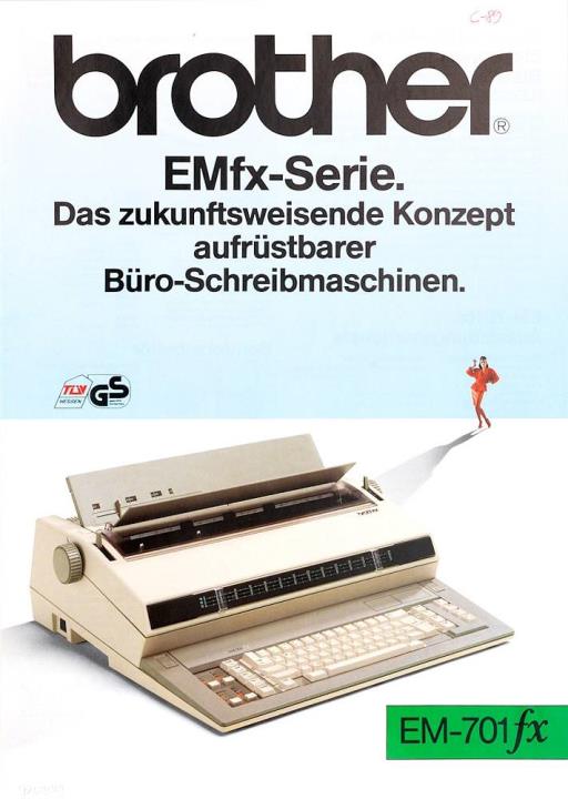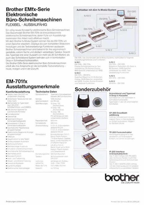 Prospekt für elektronische Schreibmaschine Brother EMfx Das zukunftsweisende Konzept aufrüstbarer Büro-SchreibmaschineNr. EM-701fx Nr. 88.04.2 BRIO 25