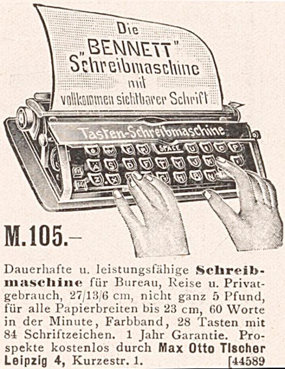 Werbeanzeige für Schreibmaschine Bennett monochrom
