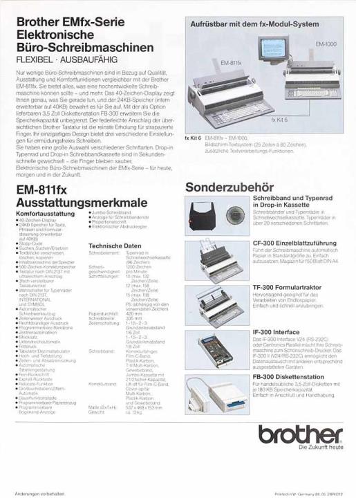Prospekt für elektronische Schreibmaschine Brother EMfx Das zukunftsweisende Konzept aufrüstbarer Büro-Schreibmaschinen EM-811fx Nr. 88.05.2 BRIO 12