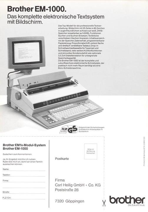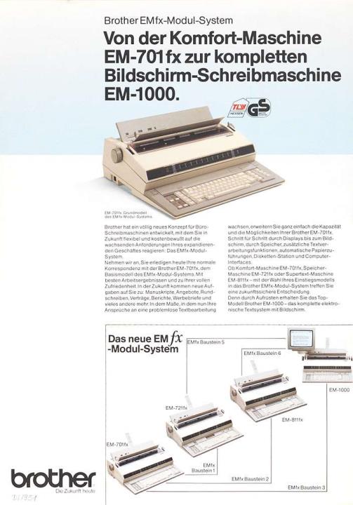 Prospekt für elektronische Schreibmaschine Brother EMfx Von der Komfort-Maschine EM-701fx zur kompletten Bildschirm-Schreibmaschine EM-1000 Nr. 87.10.2 BRIO 120