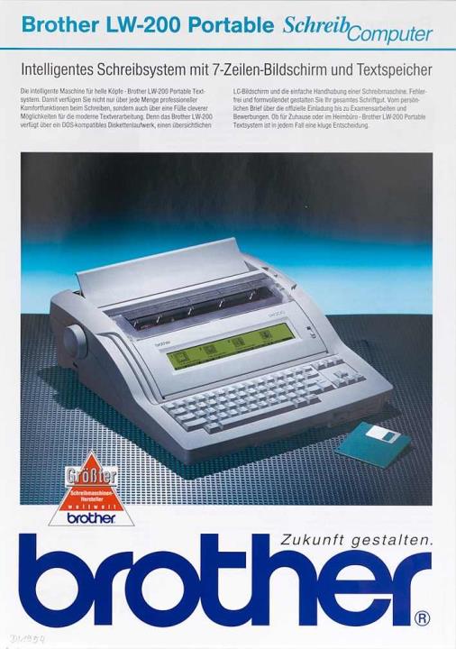 Prospekt für elektronische Schreibmaschine Brother LW-200 Intelligentes Schreibsystem mit 7-Zeilen-Bildschirm und Textspeicher Nr. 98.09.3 BRIO 25
