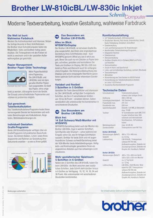 Prospekt für elektronische Schreibmaschine Brother LW-810icBL, LW-830ic Moderne Textverarbeitung, kreative Gestaltung, wahlweise Farbdruck Nr. 98.3.1.Brio 100