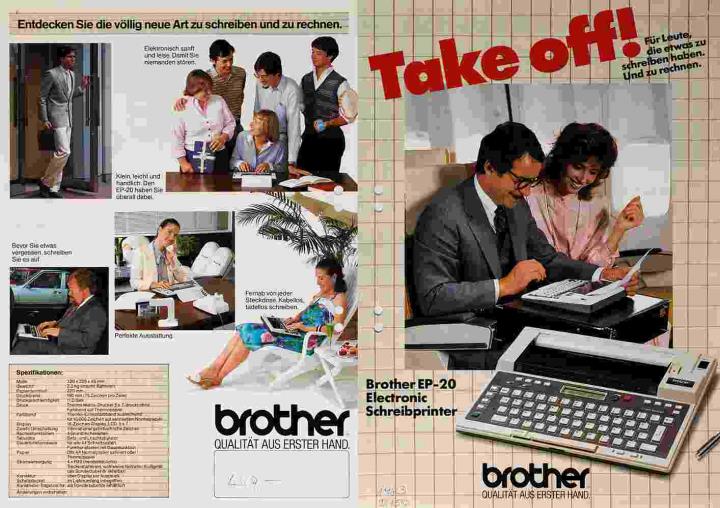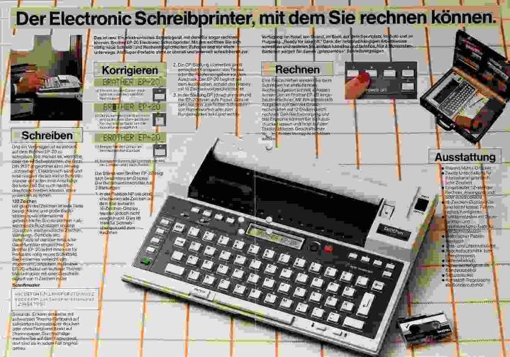Faltprospekt für elektronische Schreibmaschine Brother EP-20 Für Leute, die etwas zu schreiben haben. Und zu rechnen. Datum handschriftlich vermerkt