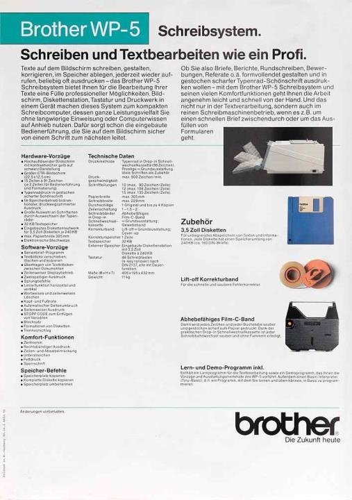 Prospekt für elektronische Schreibmaschine Brother WP-5 Schreiben und Textbearbeiten wie ein Profi Nr. 90.10.2 BRIO 50