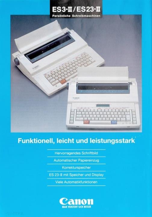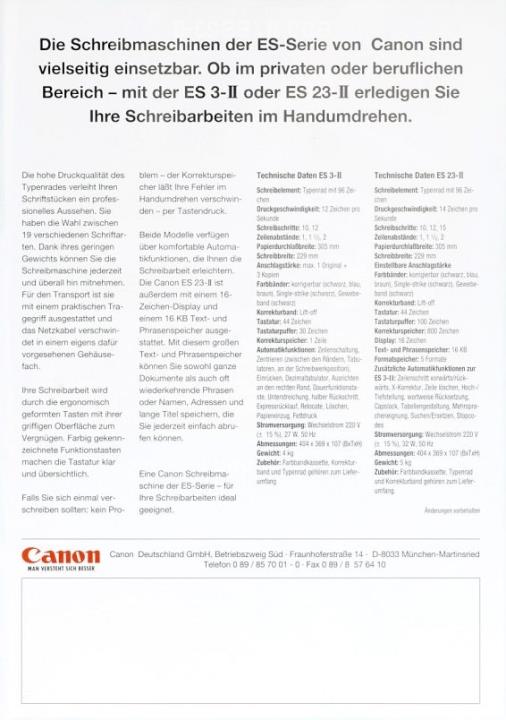 Prospekt für elektrische Schreibmaschine Canon ES3-II, ES23-II Funktionell, leicht und leistungsstark
