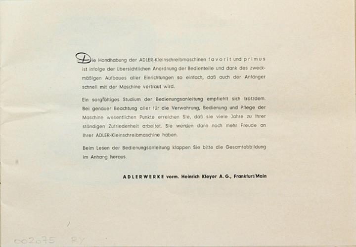 Bedienungsanleitung für Kleinschreibmaschinen Adler primus und favorit Nr. A 61/561/6 Beilage: Schreibkontrollblatt der Adler favorit Nr. 1662151; Nr. A161-TWN 3