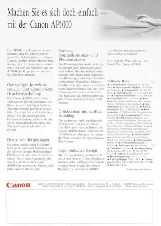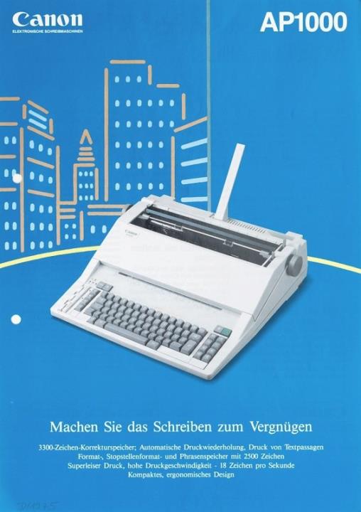 Prospekt für elektrische Schreibmaschine Canon AP1000 Machen Sie das Schreiben zum Vergnügen