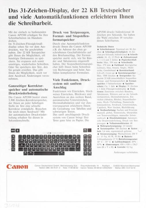 Prospekt für elektrische Schreibmaschine Canon AP1500 Für hohe Ansprüche