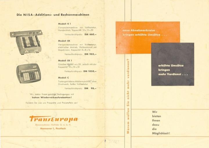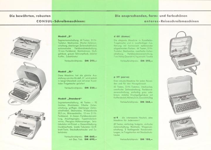 Faltprospekt für Schreibmaschine Consul, Reiseschreibmaschinen Antares und Rechenmaschinen Nisa