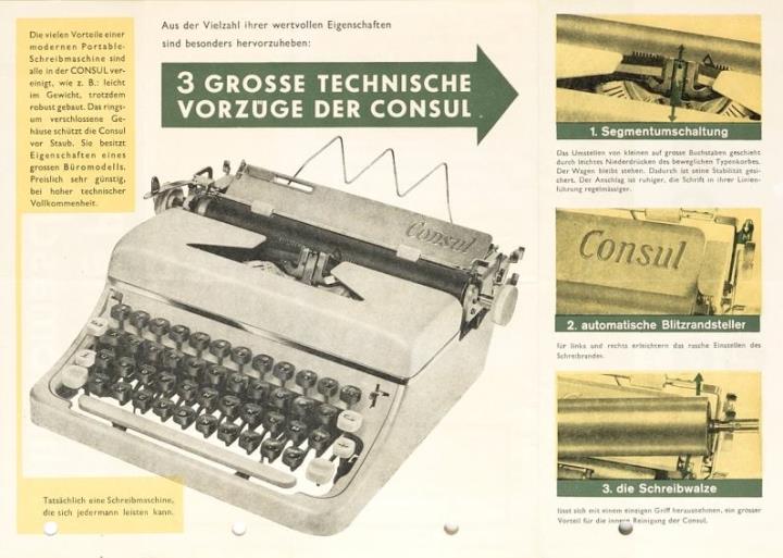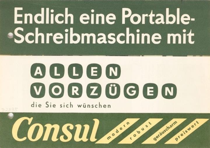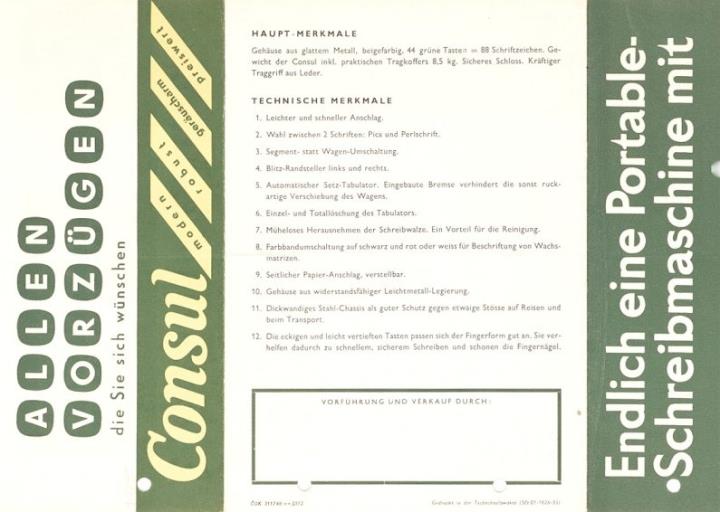 Faltprospekt für Schreibmaschine Consul Endlich eine Portable-Schreibmaschine mit allen Vorzügen die Sie sich wünschen Nr. COK 311748 n-5512