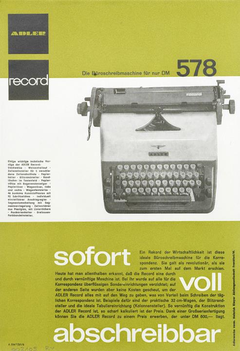 Prospekt für Schreibmaschine Adler Record Nr. A 304/1261/6
