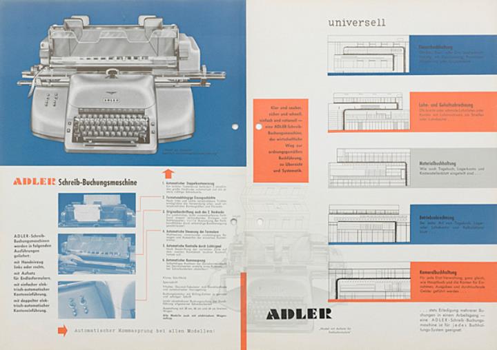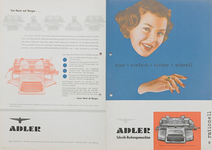 Faltprospekt für Schreib- und Buchungsmaschine Adler klar + einfach + sicher + schnell = rationell
