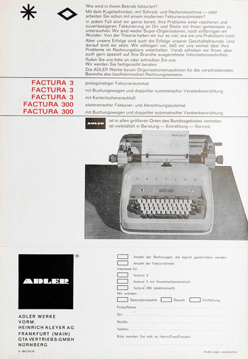 Prospekt für Schreib- und Fakturiermaschine Adler Factura Nr. A 460/364/40
