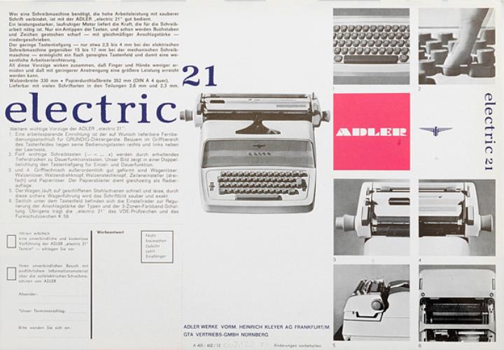 Prospekt für Schreibmaschine Adler Electric 21 Nr. A 405/462/12