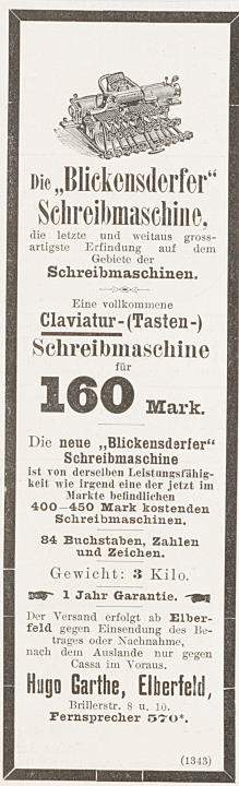 Werbeanzeige für Schreibmaschine Blickensderfer monochrom