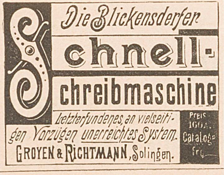 Werbeanzeige für Schreibmaschine Blickensderfer monochrom