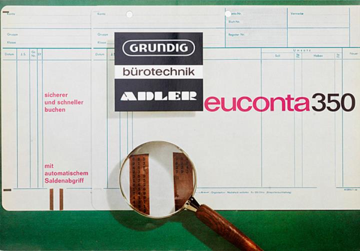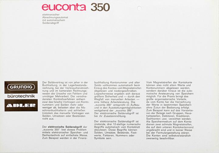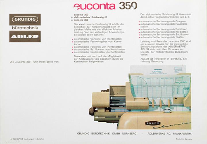 Faltprospekt für Schreib- und Buchungsmaschine Adler Euconta 350 sicherer und schneller buchen mit automatischem Saldenabgriff Nr. A 544/367/40