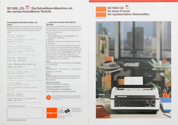 Faltprospekt für Schreibmaschine Adler SE 1000 CD-L Ihr leiser Freund für repräsentative Botschaften Nr. A 02.15.01./679/50./40