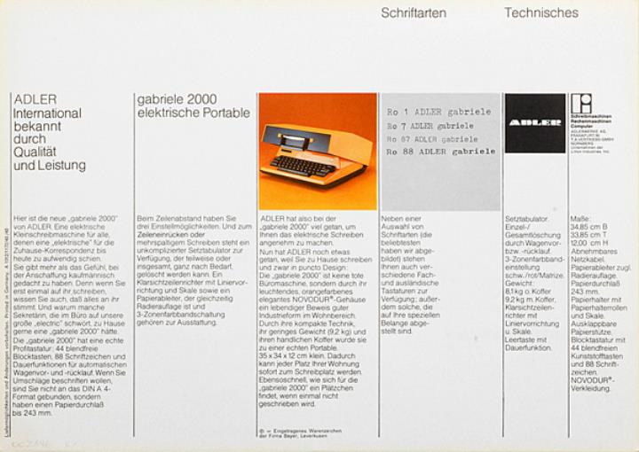 Prospekt für Schreibmaschine Adler gabriele 2000 Die elektrische Portable Nr. A 1012/1172/40./40