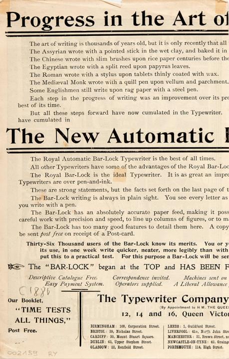 Vorderseite eines Prospekts für Schreibmaschine Bar-Lock