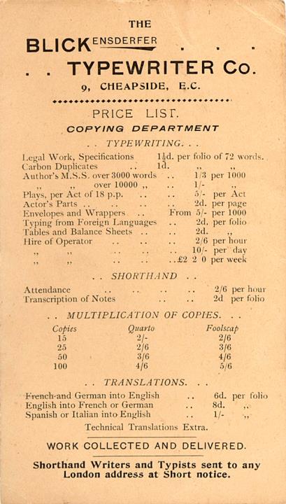 The Blickensderfer Typewriter Co. Price List
