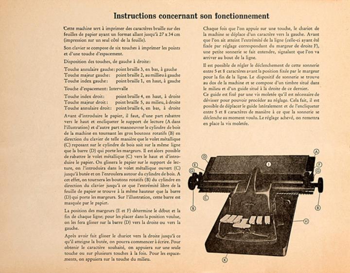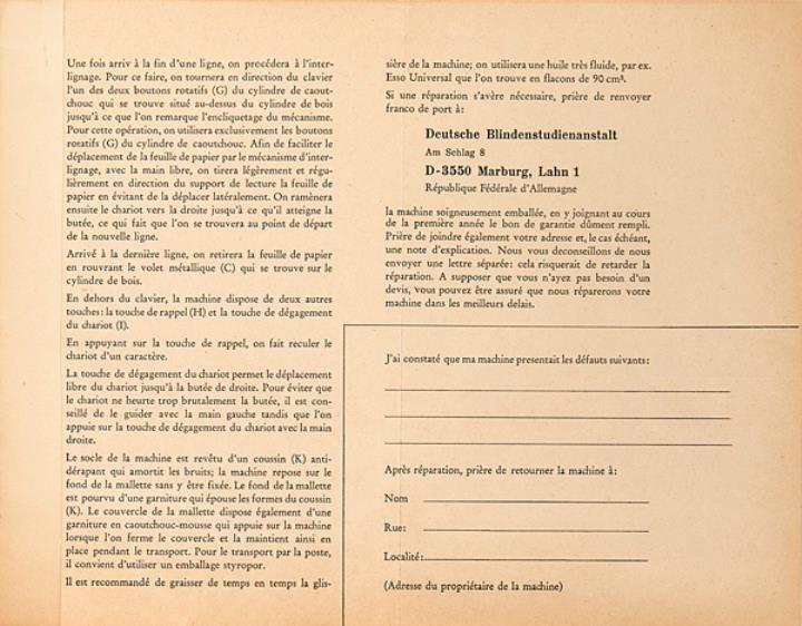 Bedienungsanleitung in französischer Sprache für Blindenschreibmaschine Blista