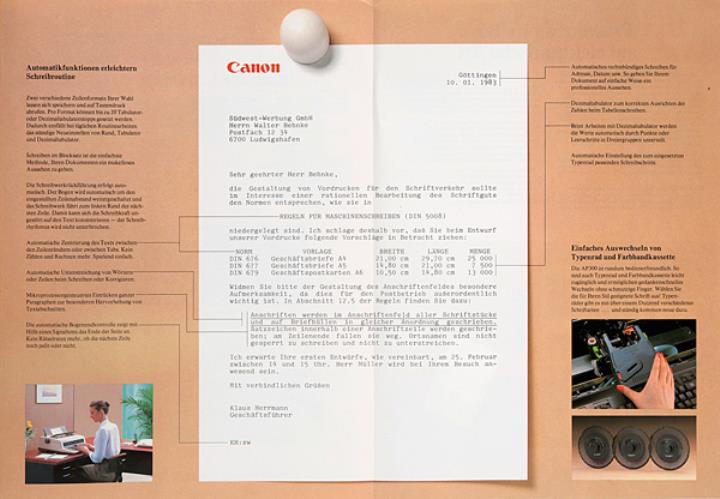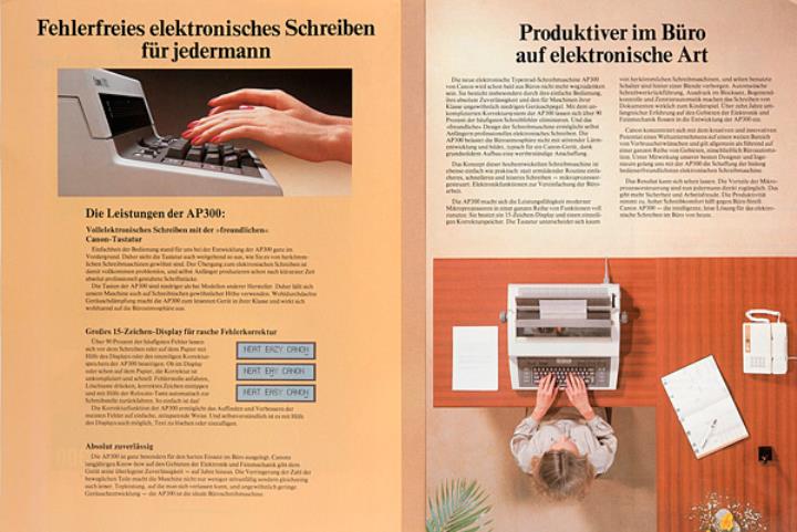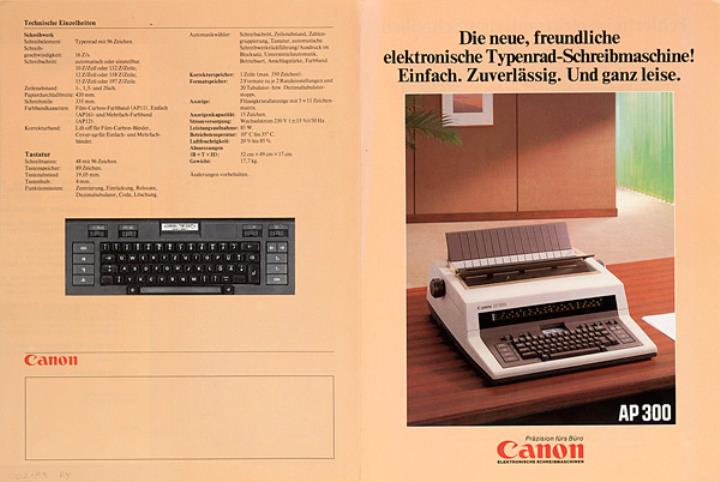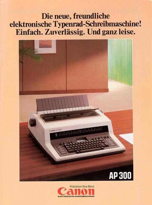 Faltprospekt für Schreibmaschine Canon AP300 Die neue, freundliche elektronische Typenrad-Schreibmaschine! Einfach. Zuverlässig. Und ganz leise.