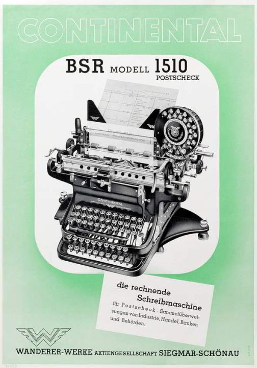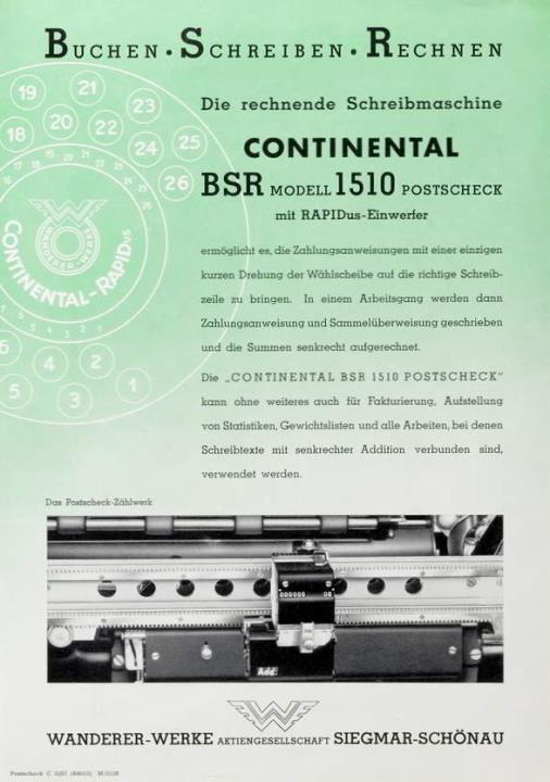 Prospekt für Schreibmaschine Continental BSR Postscheck mit Rapidus-Einwerfer die rechnende Schreibmaschine Nr. C3297 (84010)