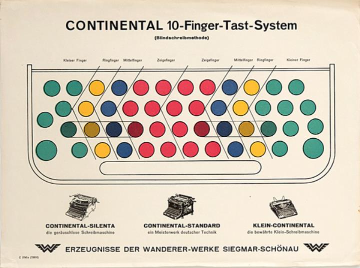 Tastaturansicht der Schreibmaschine Continental mit farblich hervorgehobenem Zehnfingersystem Nr. C 3745a (73810)
