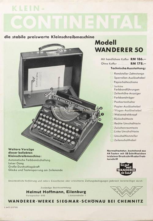 Faltprospekt für Schreibmaschine Continental Wanderer 50 die stabile preiswerte Kleinschreibmaschine Nr. C 6472 (1537100)