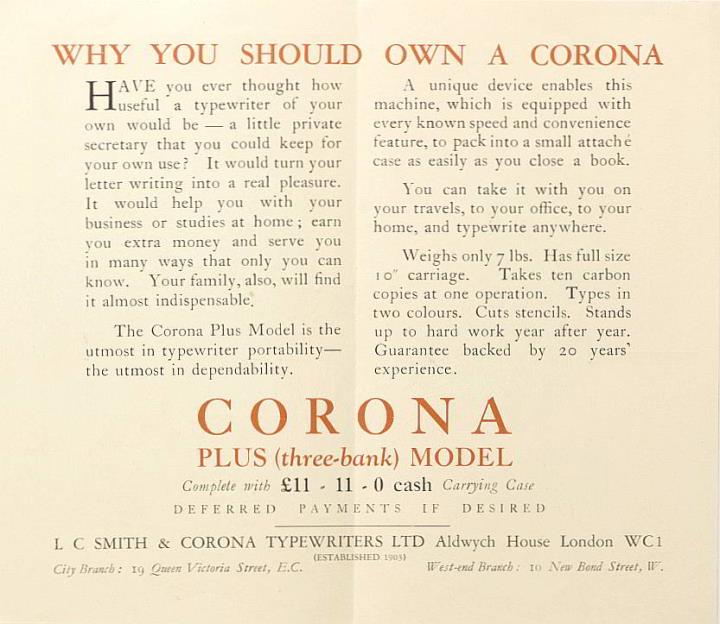 Faltprospekt für Schreibmaschine Corona Plus The personal writing machine